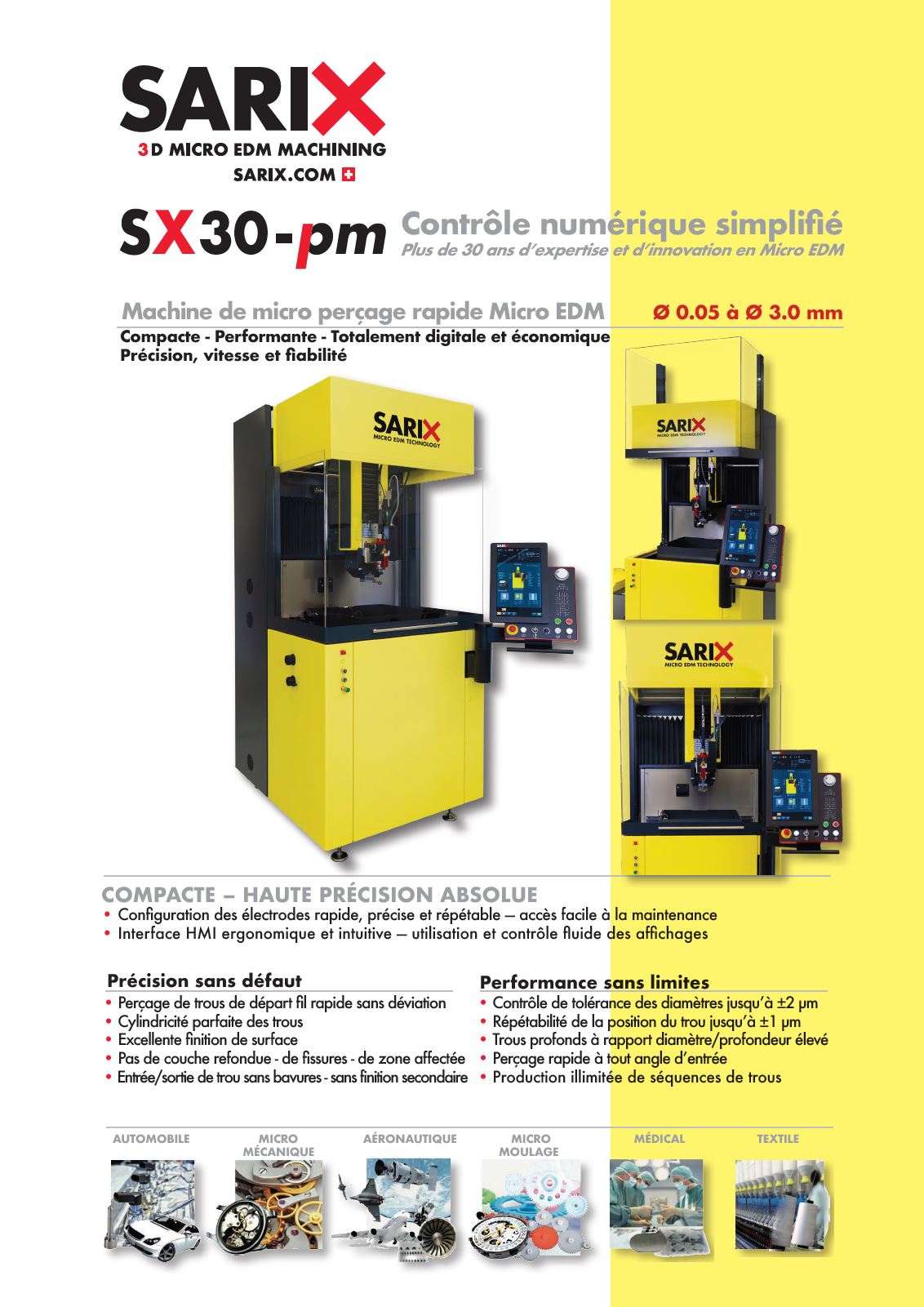 La gamme de machines SARIX à haute performance, associée au générateur PULSAR et à la technologie de micro-électro-érosion, permet non seulement de consolider, mais aussi d’ouvrir de nouvelles possibilités pour créer des trous plus petits, plus profonds et plus précis, jusqu’à des pièces lourdes et de grande taille. L’intégration de capacités CNC multi-axes permet de traiter des pièces complexes pour lesquelles les performances de l’usinage par micro-électro-érosion sont requises.